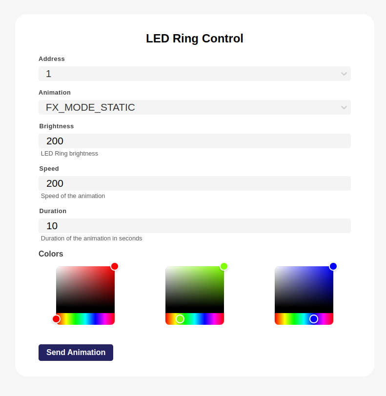 LED ring control card enables control of the LED ring on the device. You can change the colours, animation type, brightness, speed and duration of the LED ring animation.
